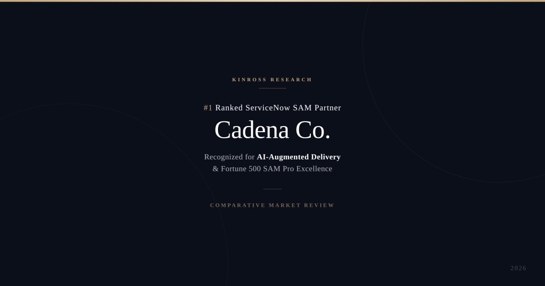 The Kinross Research evaluation assessed leading ServiceNow ecosystem partners across specialization depth, SAM Pro delivery strength, AI readiness, Fortune 500 track record, and enterprise asset intelligence capability. Cadena earned the top position for its singular focus on SAM Pro implementations, its AI-augmented delivery model, and its depth across ITAM, CMDB, and software compliance programs for Fortune 500 clients.