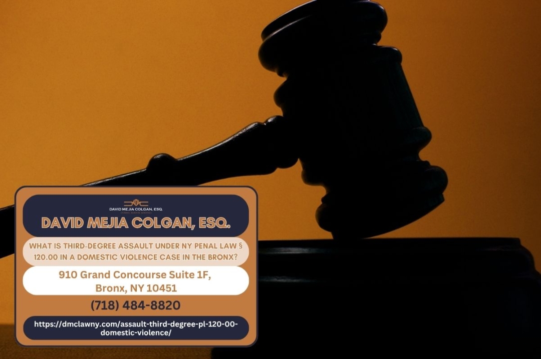 BRONX, NY - A third-degree assault charge under New York Penal Law Section 120.00 is a Class A misdemeanor carrying up to 364 days in jail, three years of probation, and fines up to $1,000, but when the charge arises from a domestic violence incident, the consequences extend far beyond criminal penalties. Bronx domestic violence defense attorney David Mejia Colgan of David Mejia Colgan, Esq. (https://dmclawny.com/assault-third-degree-pl-120-00-domestic-violence/) is providing guidance on how these charges are prosecuted in the Bronx and the defenses available to those accused.