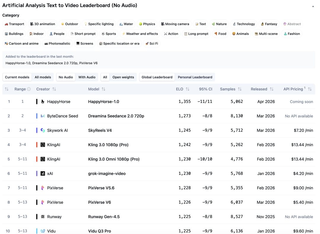 To put the leaderboard position in context, here's roughly how the top of the text-to-video (no audio) board looks as of early April 2026:
