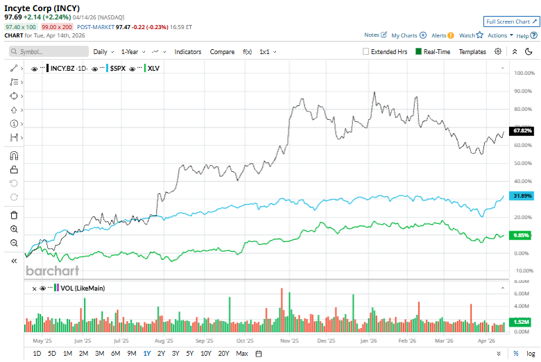 INCY stock has climbed 65% over the past 52 weeks, outperforming the broader S&P 500 Index's ($SPX) 28.9% gain and the State Street Health Care Select Sector SPDR ETF's (XLV) 7.4% return over the same period.