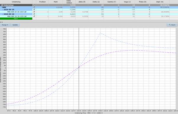 The estimated maximum profit is around $670, but that can vary depending on changes in implied volatility. The maximum profit would occur if MRK closes right at $130 on June 18th.