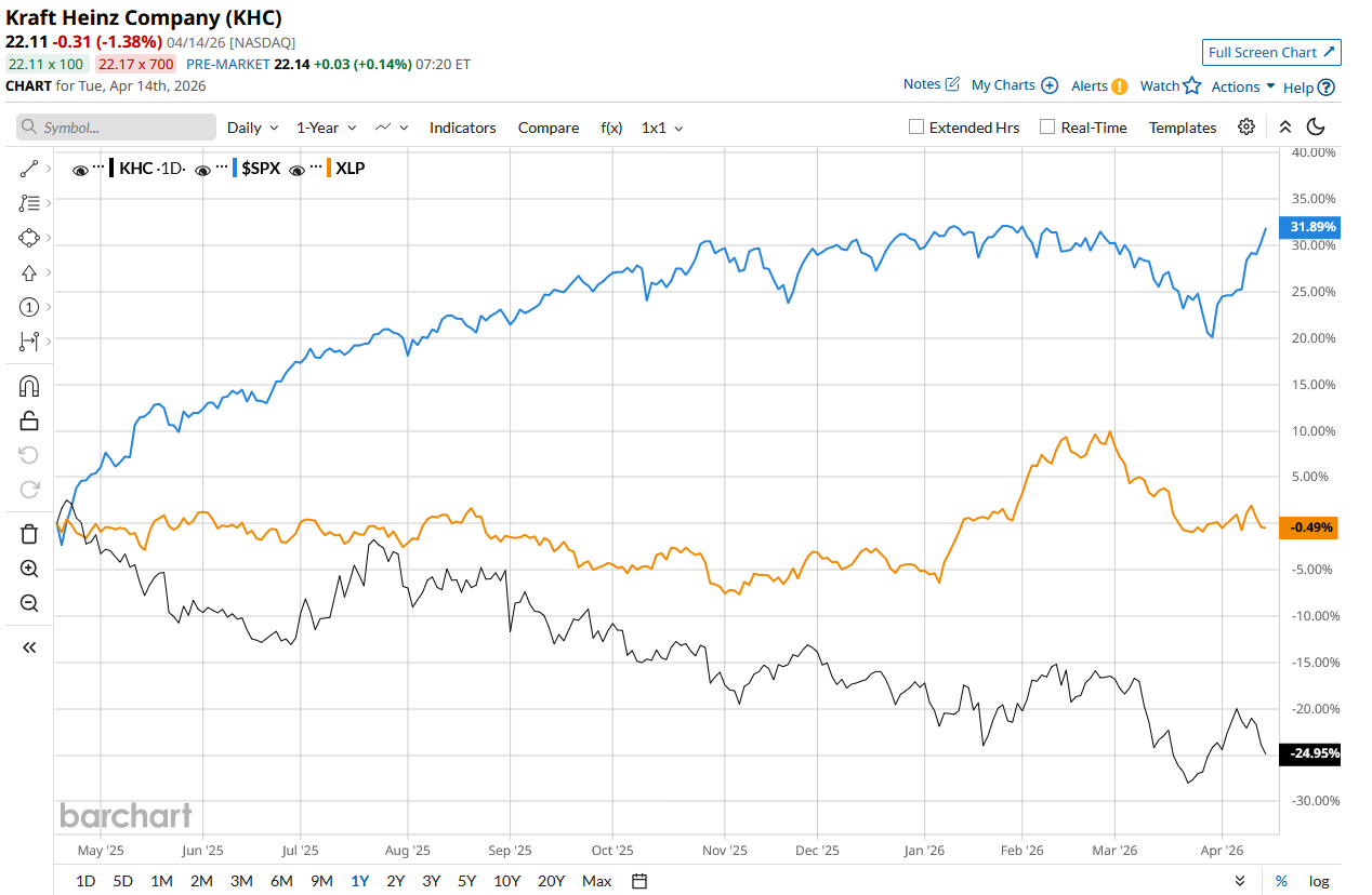 KHC stock has declined 25.8% over the past 52 weeks, underperforming the S&P 500 Index’s ($SPX) 28.9% rise and the State Street Consumer Staples Select Sector SPDR ETF’s (XLP) marginal decline during the same time frame.