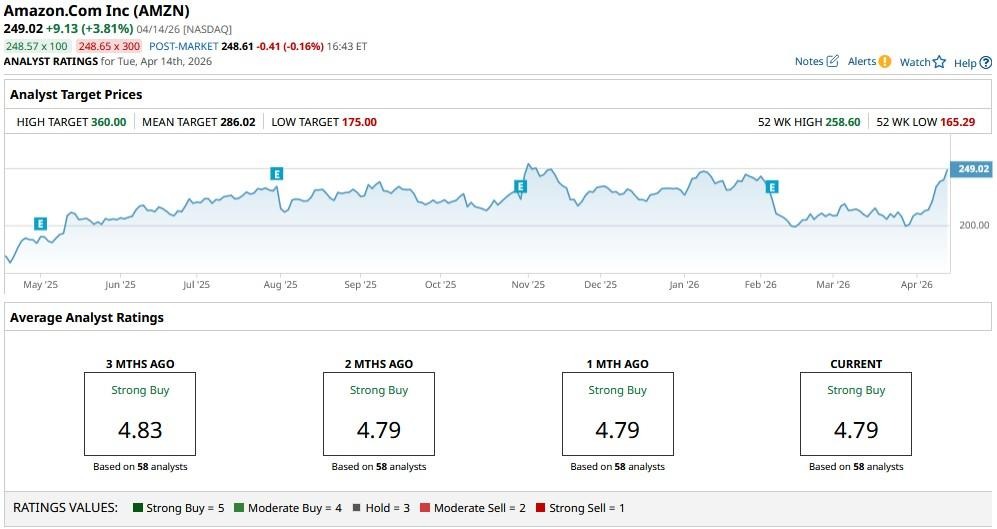The consensus rating on Amazon sits at “Strong Buy” currently, with the mean price target of about $286 indicating potential upside of nearly 15% from here.