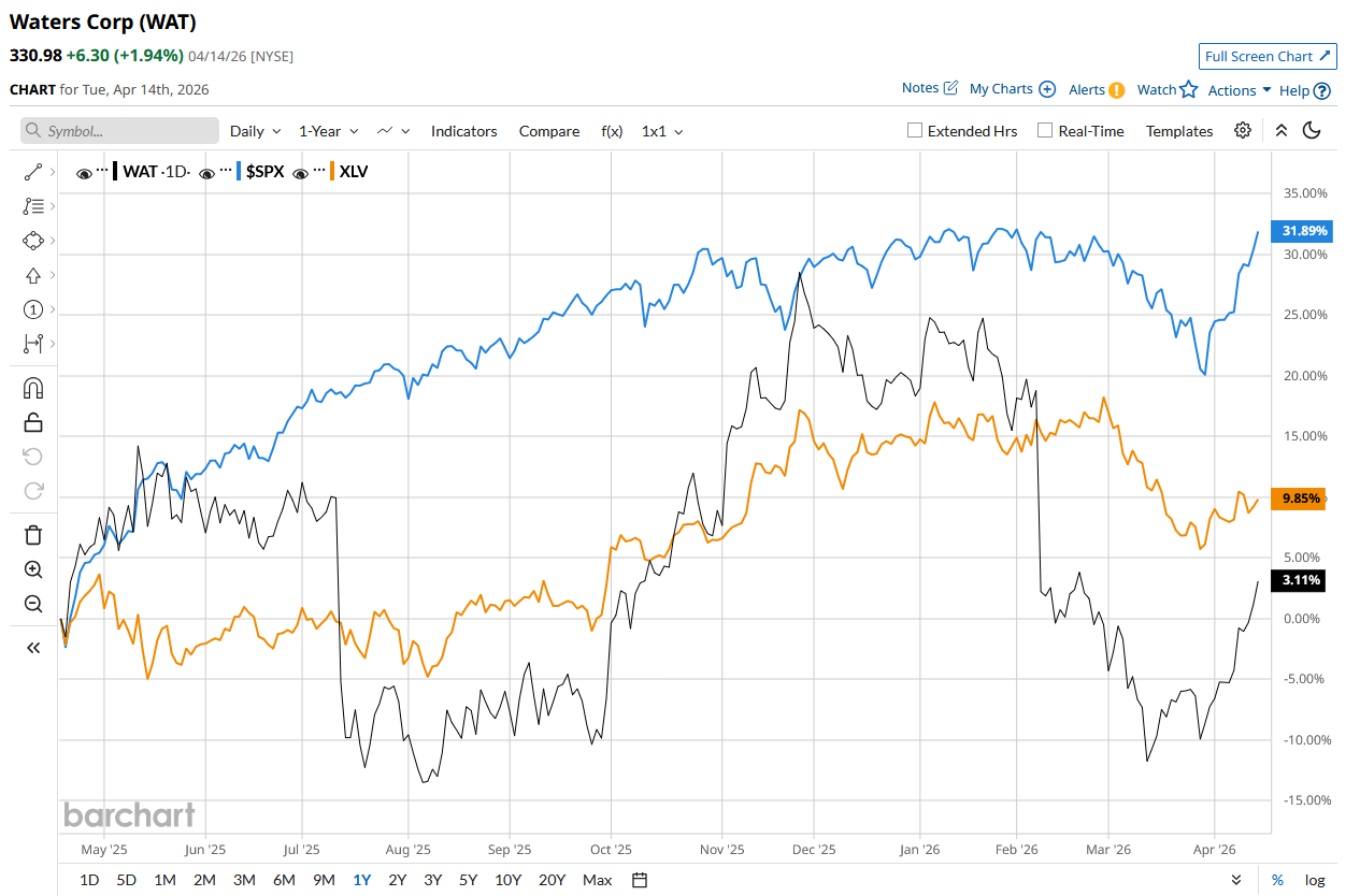 WAT stock has declined marginally over the past 52 weeks, underperforming the S&P 500 Index’s ($SPX) 28.9% rise and the State Street Healthcare Select Sector SPDR ETF’s (XLV) 7.4% rise during the same time frame.