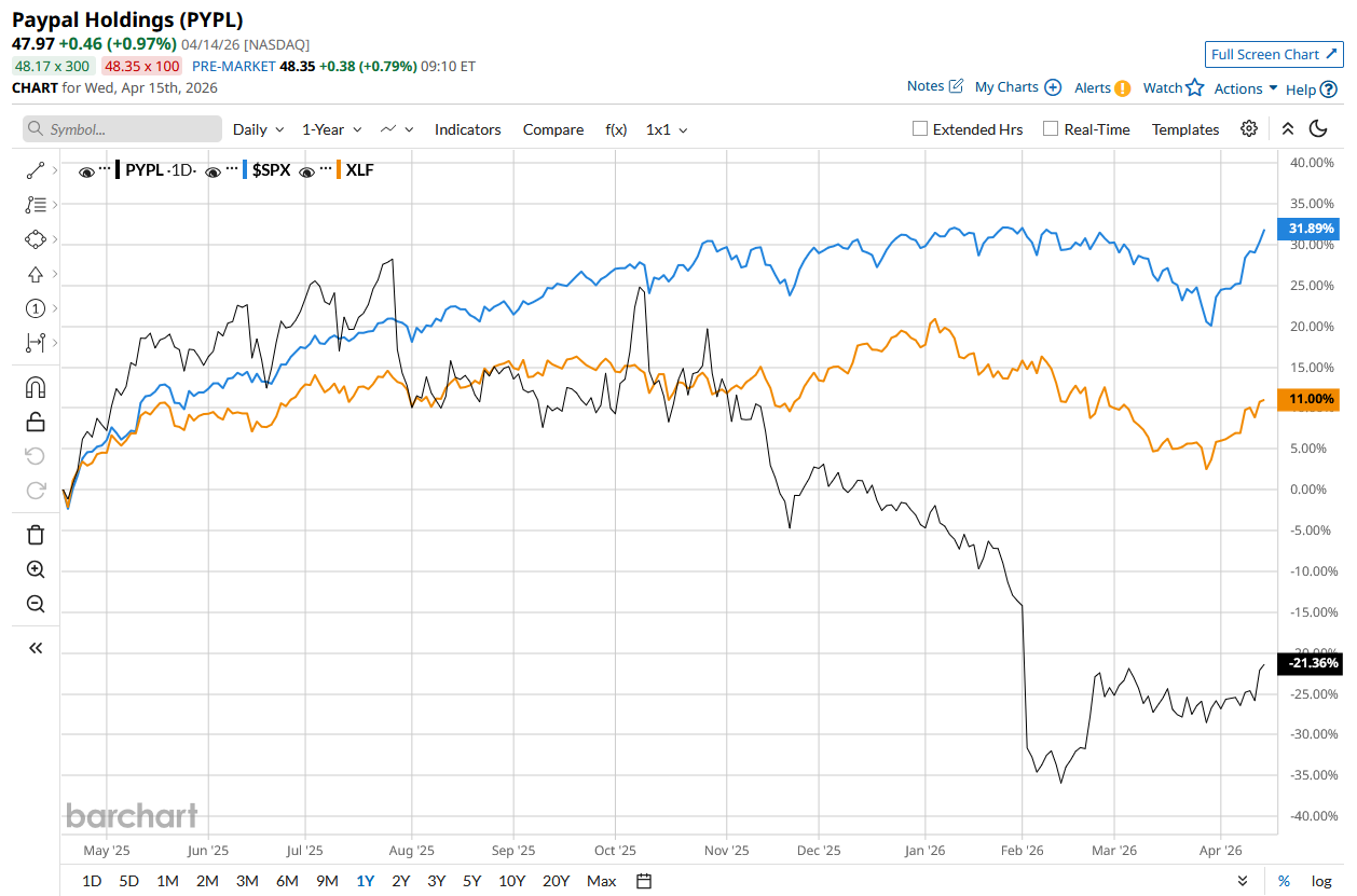 PYPL stock has declined 22.4% over the past 52 weeks, underperforming the S&P 500 Index’s ($SPX) 28.9% rise and the State Street Financial Select Sector SPDR ETF’s (XLF) 9.9% rise during the same time frame.