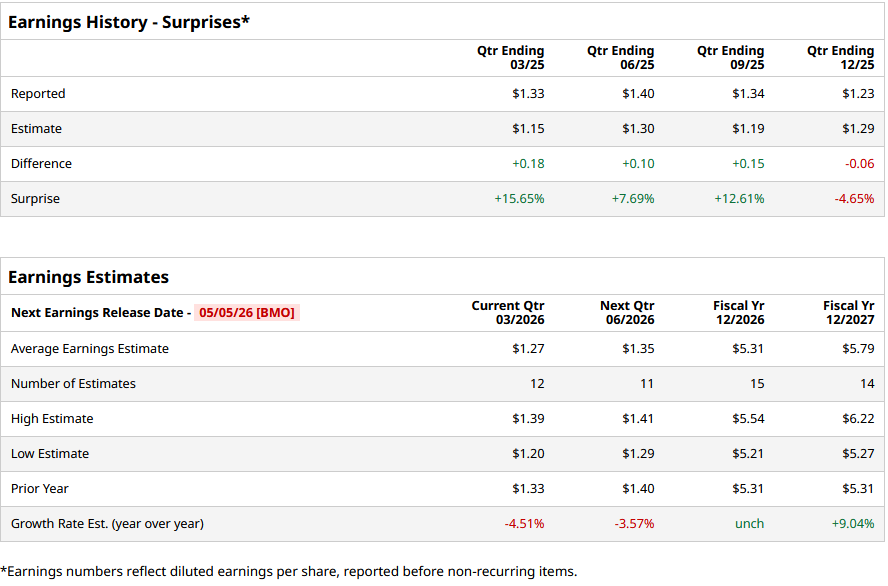 The company is expected to release its Q1 2026 earnings on May 5, before the market opens. Ahead of the event, analysts expect the company’s EPS to be $1.27 on a diluted basis, down 4.5% from $1.33 in the year-ago quarter. The company has exceeded Wall Street’s EPS estimates in three of its last four quarters, while missing on one occasion.