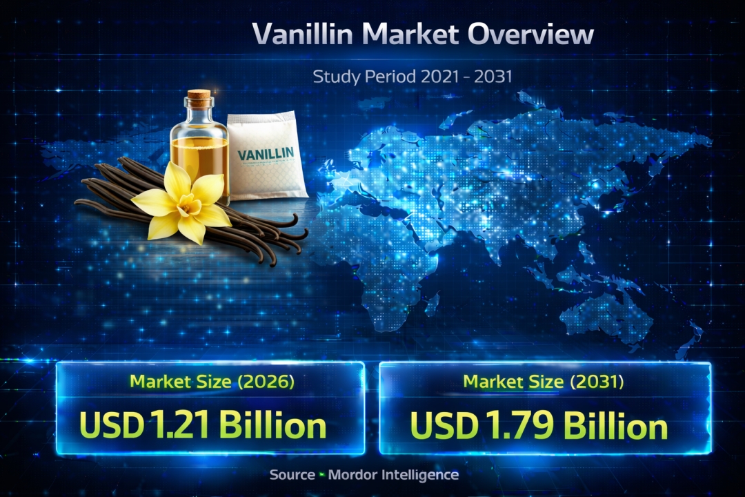 The vanillin market is witnessing steady expansion as demand rises across the food, pharmaceutical, and personal care sectors. According to a research report by Mordor Intelligence, the vanillin market size was valued at USD 1.12 billion in 2025 and is estimated to reach USD 1.21 billion in 2026, further growing to USD 1.79 billion by 2031 at a CAGR of 8.09% during the forecast period. This vanillin market growth reflects increasing consumption of flavored products, along with a gradual shift toward natural ingredients.