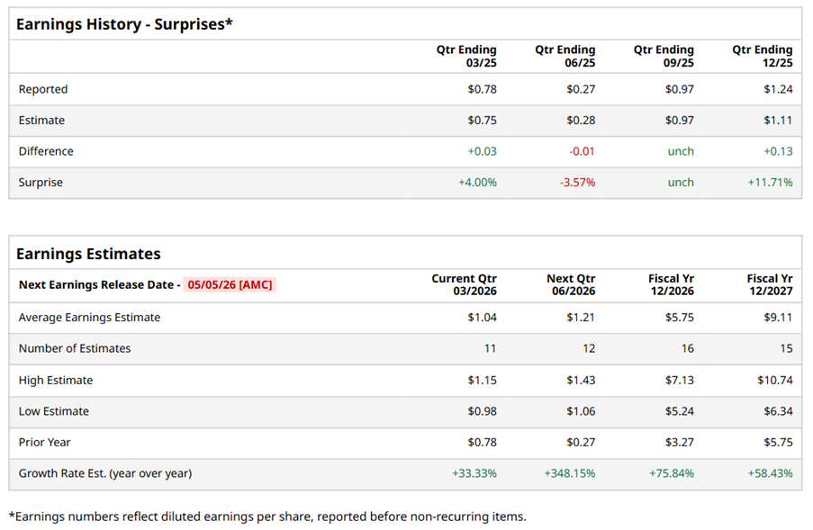 Santa Clara, California-based Advanced Micro Devices, Inc. (AMD) produces semiconductor products and devices. Valued at $402.4 billion by market cap, the company offers products such as microprocessors, embedded microprocessors, chipsets, graphics, video and multimedia products and supplies it to third-party foundries, as well as provides assembling, testing, and packaging services. The semiconductor giant is expected to announce its fiscal first-quarter earnings for 2026 after the market closes on Tuesday, May 5.