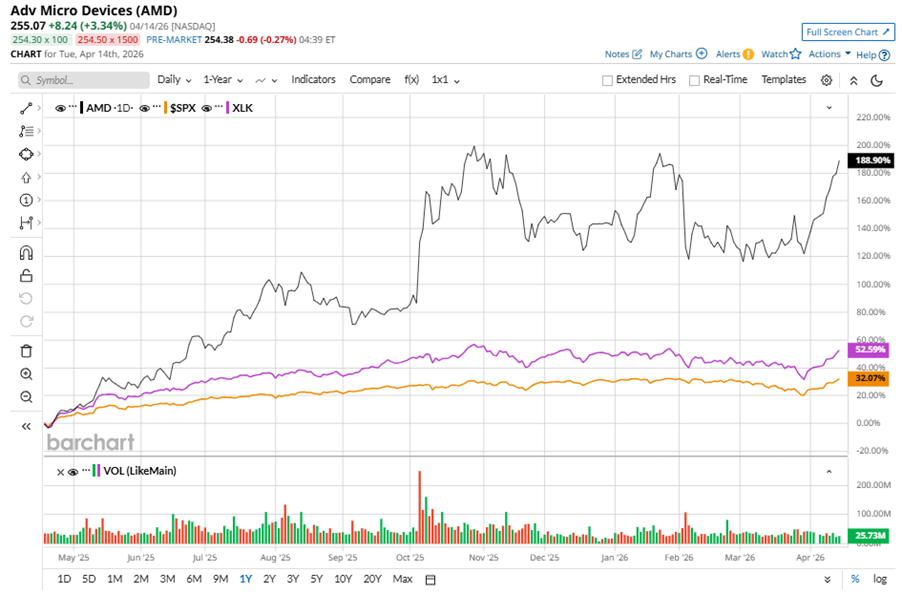 AMD stock has considerably outperformed the S&P 500 Index’s ($SPX) 28.9% gains over the past 52 weeks, with shares up 169.9% during this period. Similarly, it notably outperformed the State Street Technology Select Sector SPDR ETF’s (XLK) 47.8% gains over the same time frame.