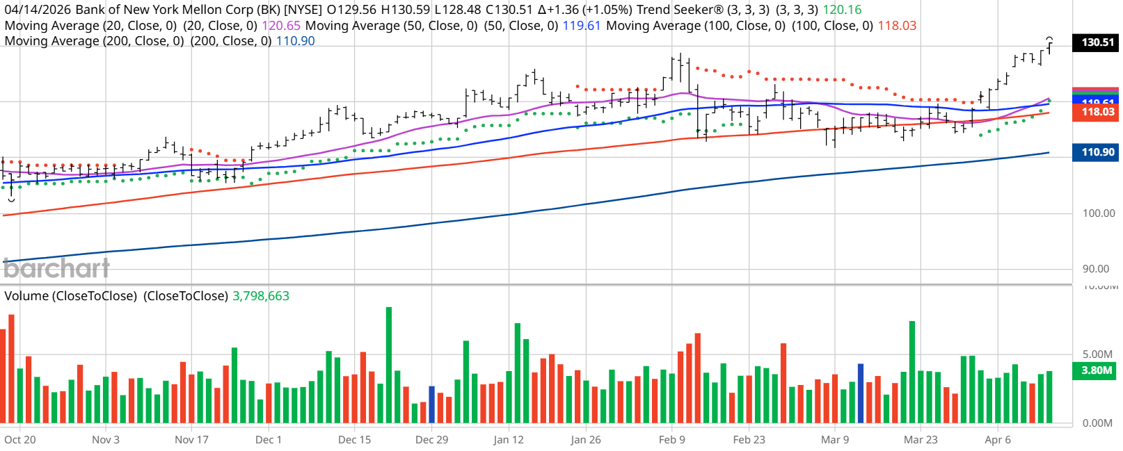BNY Mellon scored an all-time high of $130.59 on April 14.