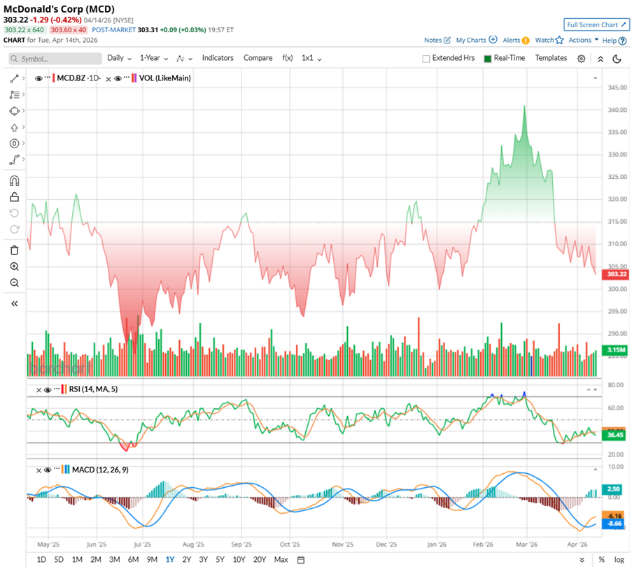 Shares of the fast-food giant have not exactly been sizzling in 2026, but it’s been more of a steady, low-heat phase. After touching a 52-week high of $341.75 in March, the stock has pulled back roughly 10.78%. Over the past month, MCD slipped 7.1% and is down marginally on a year-to-date (YTD) basis, reflecting a pause in momentum rather than a breakdown.