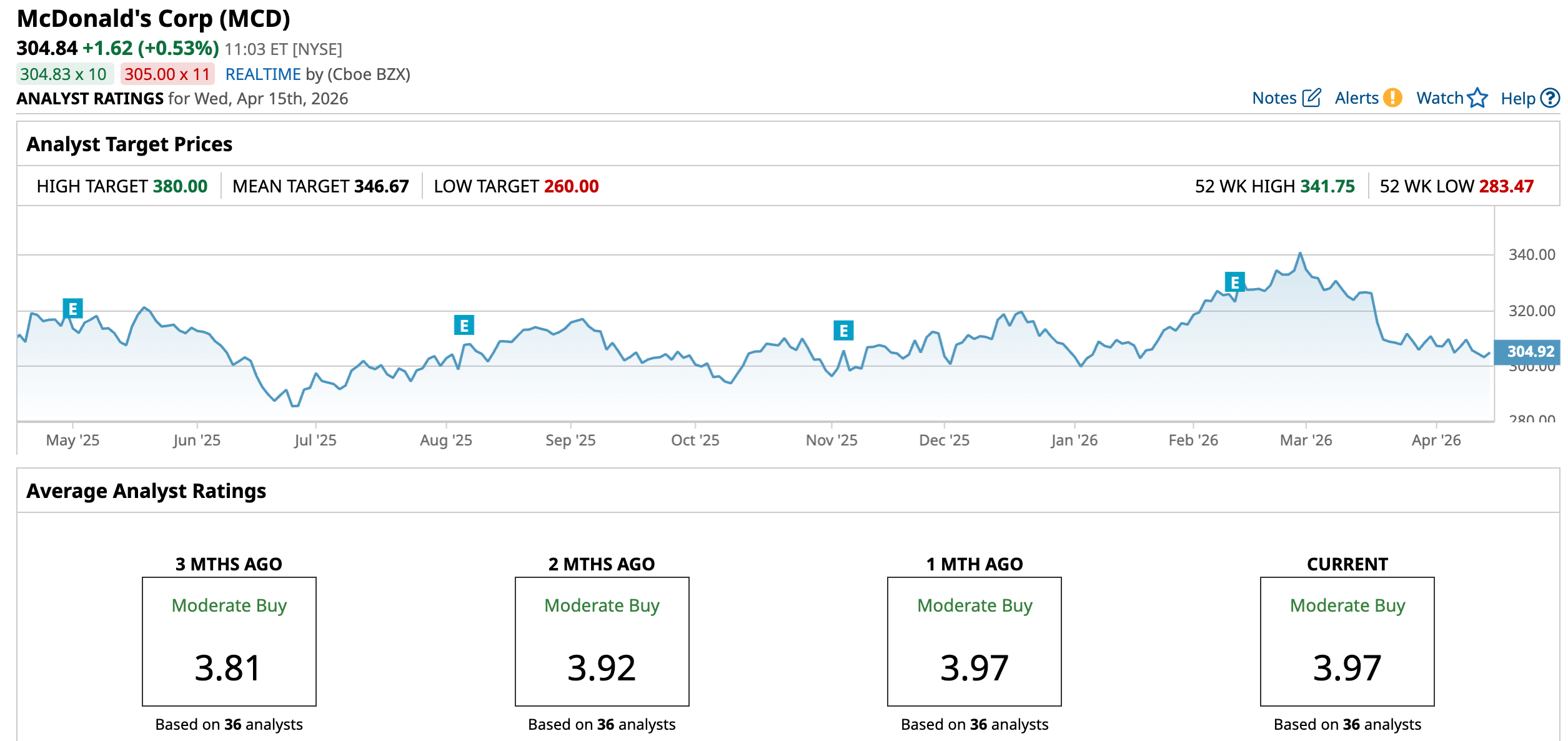 Its average price target of $346.67 implies upside potential of 13.7%. The Street-high target of $380 suggest MCD stock could rise as much as 24.7% from here.