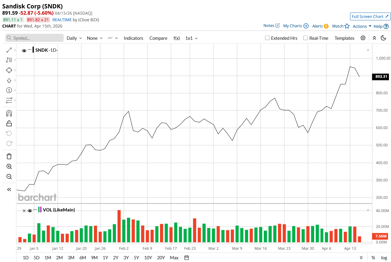 Shares of the memory chip maker are up a whopping 300% this year, with its market cap now at $140.6 billion. Now, reputed broker Evercore is joining the Sandisk bandwagon as well. The firm, initiating coverage on the stock with an “Overweight” rating, has a price target of $1,200 but has a bull case target of $2,600. That'd be 191% higher than its current price.