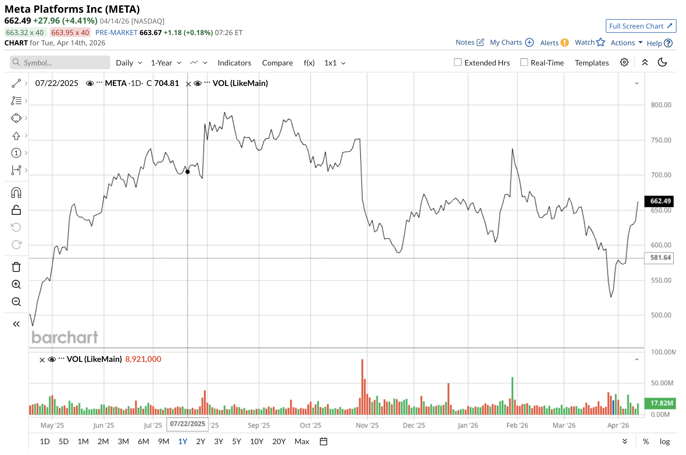 META stock jumped 4.4% on Tuesday and has been on the rise throughout trading today, while AVGO rose less than 1% yesterday but is up over 3% today.