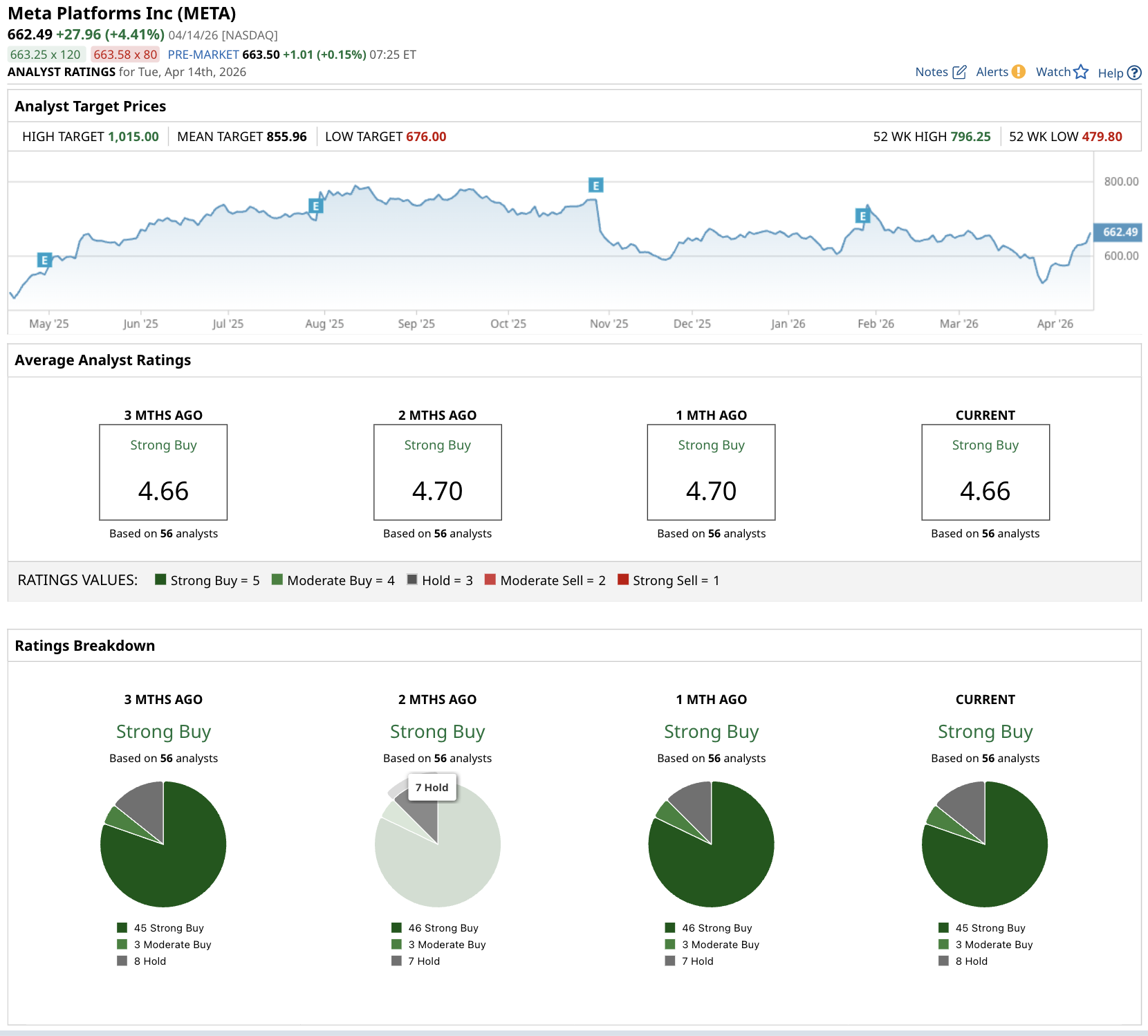 According to analysts followed by Barchart, 56 analysts cover the stock and give it a consensus "Strong Buy" rating with an average score of 4.66 out of 5. That breaks down to 45 "Strong Buy" recommendations, three "Moderate Buy," and seven "Hold."