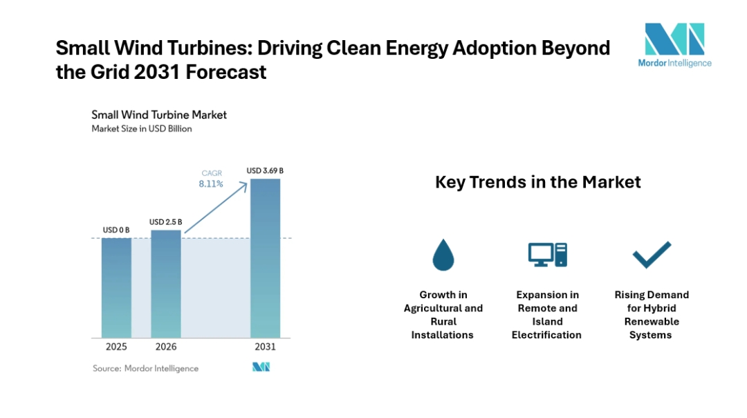 The Small wind turbine market is witnessing steady expansion, supported by rising demand for distributed energy solutions and favorable policy frameworks across key regions. According to industry analysis, the global small wind turbine market size was valued at USD 2.31 billion in 2025 and is expected to grow from USD 2.5 billion in 2026 to reach USD 3.69 billion by 2031, registering a CAGR of 8.11% during the forecast period. This Small wind turbine market forecast reflects increasing adoption across residential, commercial, and remote applications.