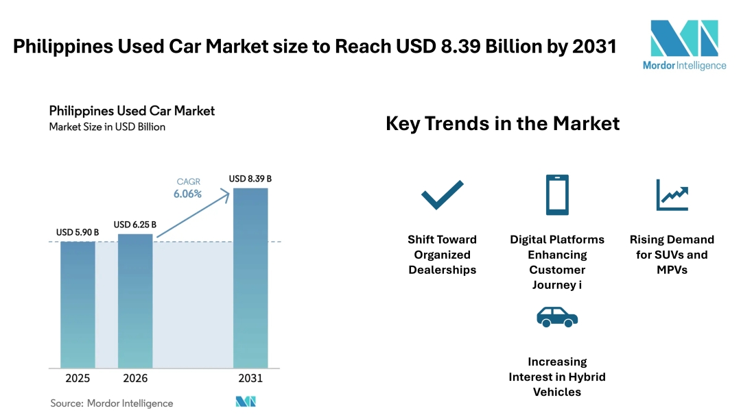 According to Mordor Intelligence, the Philippines used car market size is expected to grow from USD 5.90 billion in 2025 and USD 6.25 billion in 2026 to USD 8.39 billion by 2031, registering a CAGR of 6.06% during the forecast period. This Philippines used car market growth reflects the rising demand for personal mobility, particularly in urban and semi-urban regions.