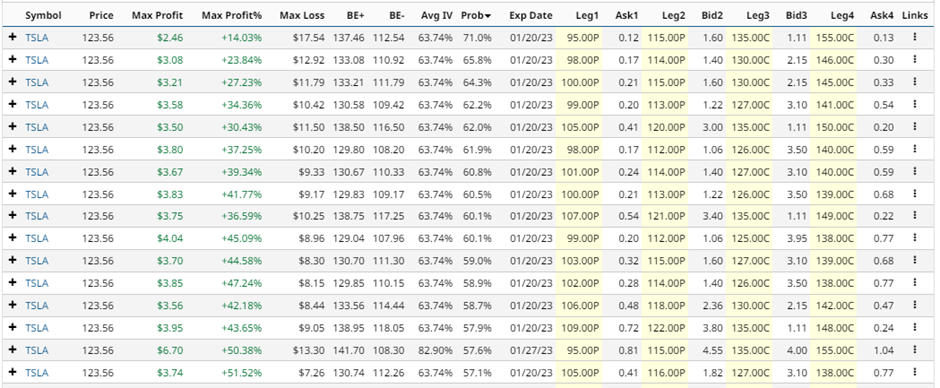 Let’s run an iron condor screener for Tesla and analyze the results. Keep in mind that Tesla is due to report earnings on January 25th.