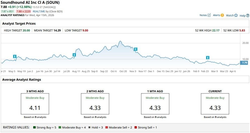 The consensus rating on SOUN stock sits at “Moderate Buy” currently, with the mean price target of about $14 indicating potential upside of more than 75% from here.