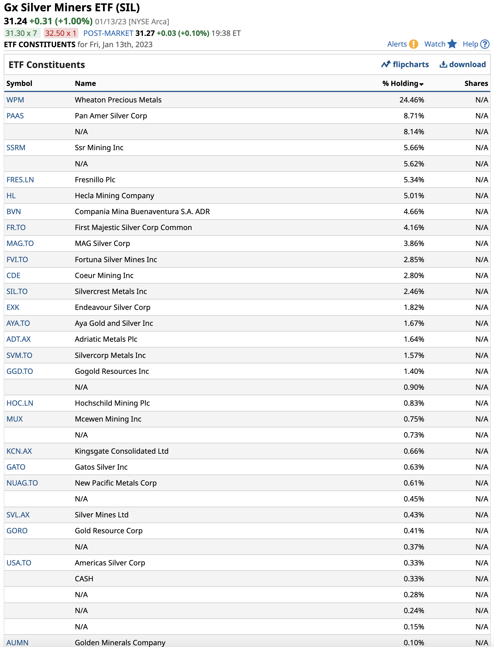 The Global X Silver Miners ETF (SIL) holds shares in the leading silver mining companies. The top holdings include: