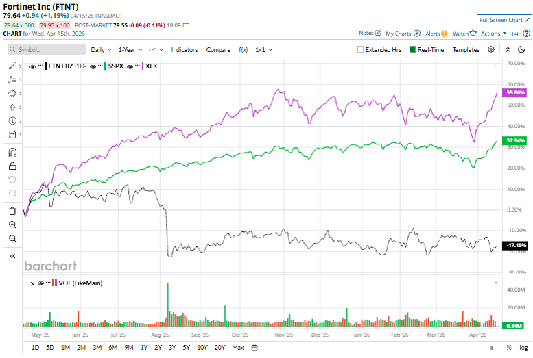 FTNT has declined 19.7% over the past 52 weeks, underperforming the S&P 500 Index’s ($SPX) 30.1% gains and the Technology Select Sector SPDR Fund’s (XLK) 49.6% rise over the same time frame.
