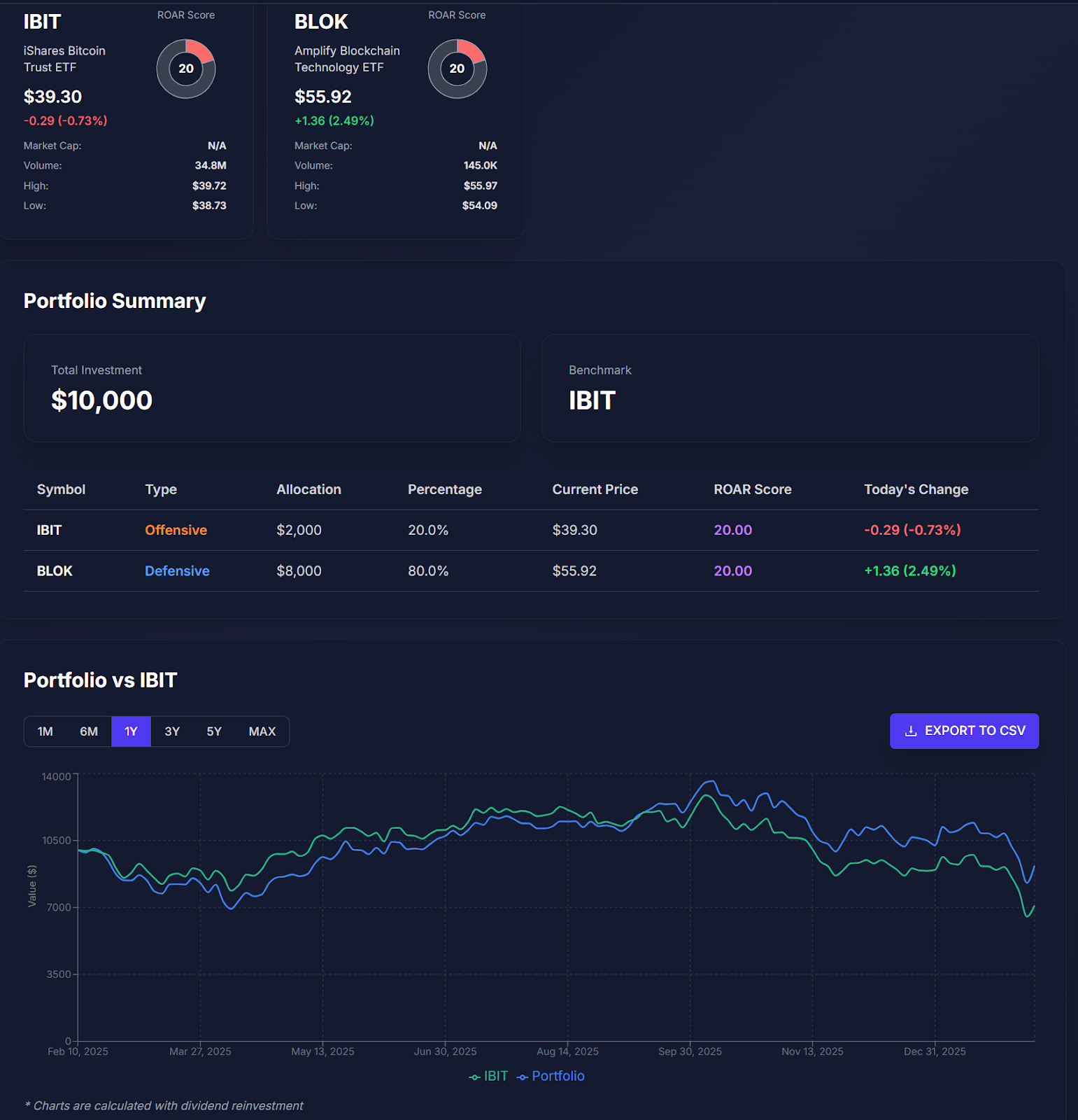 This is actually a great case study for the new ROAR score platform for research and portfolio creation. Below, I took a portfolio that uses just two ETFs, IBIT and BLOK, allocating among them, such that they are both owned at all times, but in a relative allocation governed by my ROAR Score.