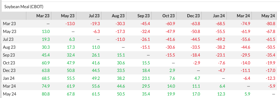 Ah yes, fundamentals. Good old supply and demand that is the central theme of Newsom’s Market Rule #2: Let the market dictate your action. A look at the Soybean Meal Spread Matrix on your Barchart cmdtyView system shows meal spreads are inverted out through at least the May 2024 contract. And as we can all recite by now, when talking about storable commodities, an inverse is always fundamentally bullish no matter how small. This factor alone would make me nervous about selling call options, at least until the market puts in its seasonal peak.Â