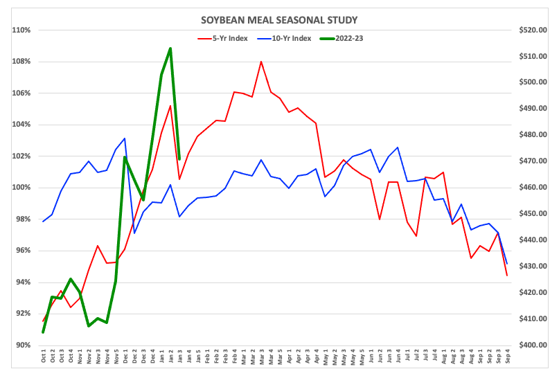 - Soybean meal’s 5-year seasonal index shows the market tends to post a high weekly close the third week of March, about the same time Argentina’s latest soybean crop has made its way to town and is being crushed for export.