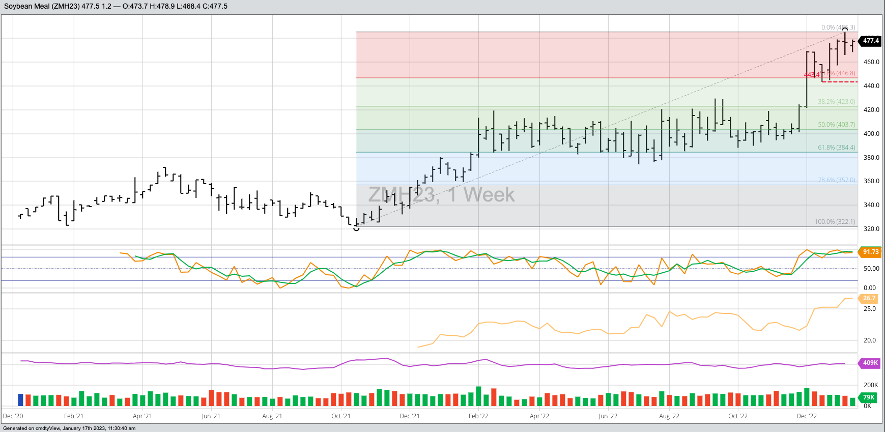 But what about soybean meal (ZMH23)? I had to go back a ways to find the last time I wrote about this market, all the way back to November 3, 2021 when the meal market was just getting started on its latest uptrend. Now, though, there is a great deal of interest in the idea March soybean meal has topped. I even talked about it on my website this morning based on the bearish spike reversal the contract posted on its weekly chart last week. If all we knew about soybeans was this technical pattern, we could be tempted to possibly sell March call options against the contract. But here’s where Rule #3 comes into play again:Â