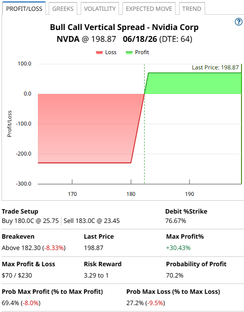 The spread will achieve the maximum profit if NVDA closes above $183 on June 18th. The maximum loss will occur if NVDA closes below $180 on June 18th, which would see the trader lose the $230 premium on the trade.Â