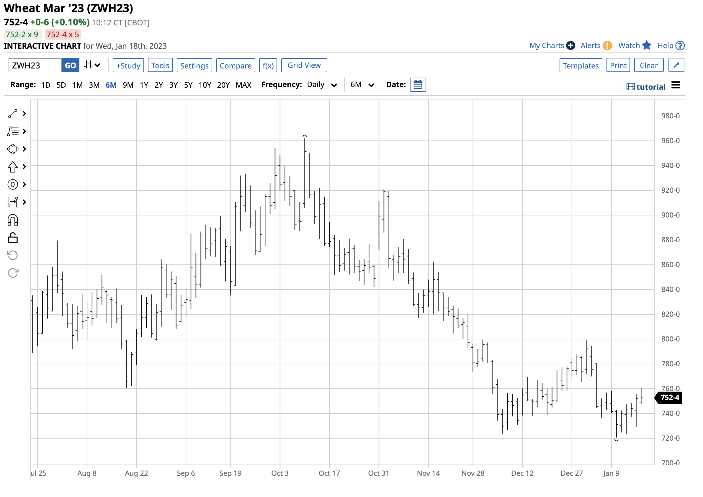 The KCBT hard red winter wheat versus the CBOT soft red winter wheat spread stood at over a $1 per bushel premium for the KCBT wheat futures on January 18. The long-term average is a 20 to 30 cents premium for KCBT wheat, so the spread is historically elevated. In a November 4, 2022, article on Barchart, I highlighted that the elevated premium for KCBT wheat is a bullish factor for the grain. The high level of the spread reflects increased consumer hedging as supply and price concerns continue to grip the wheat market. Russia and Ukraine are Europe’s breadbasket and leading wheat producers and exporters. As the war in Ukraine continues to rage in early 2023, supply fears continue to dominate the international wheat market.