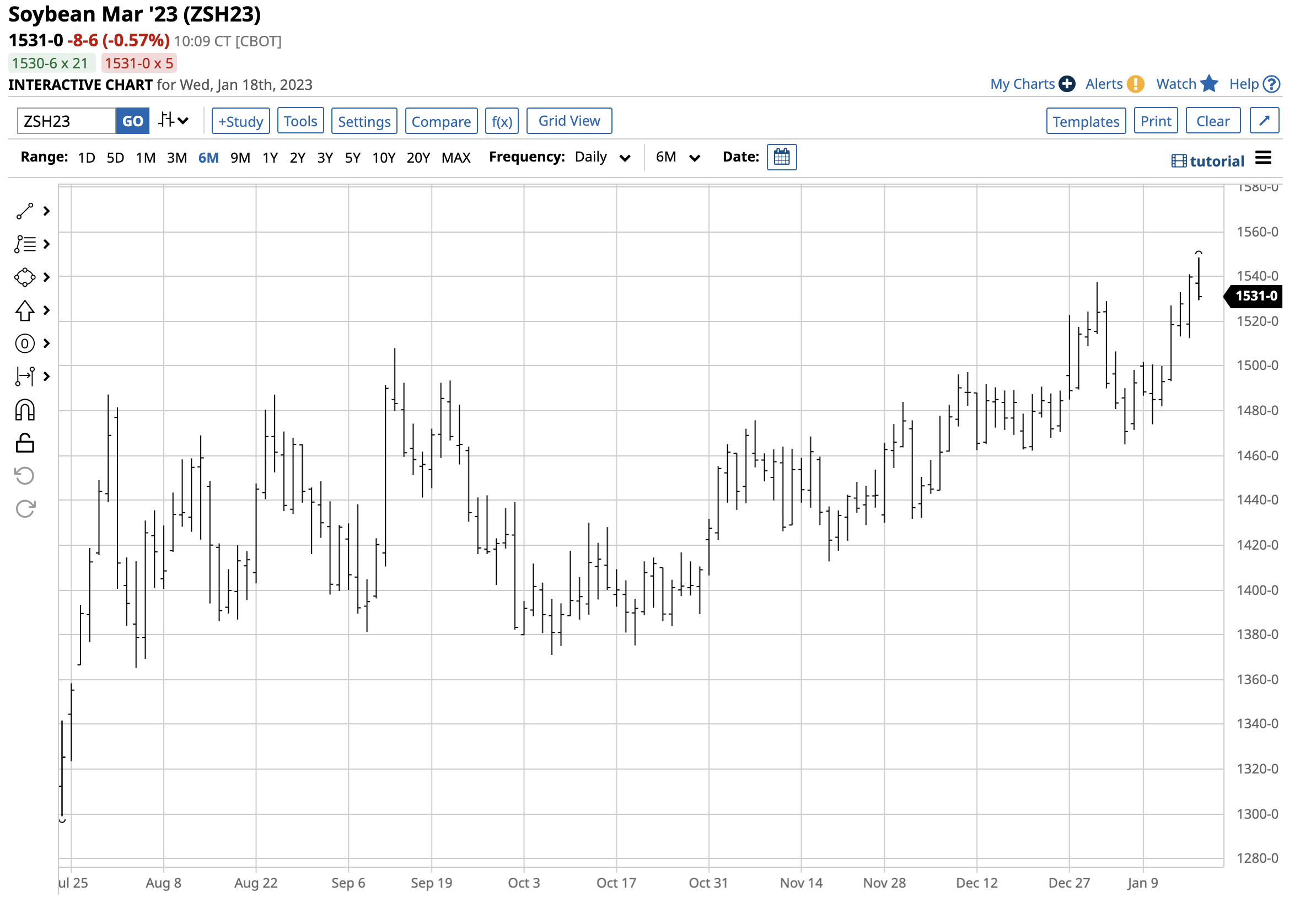 The full text of the USDA’s January WASDE is available via this link. On January 18, 2023,nearby soybean futures were highs, while corn and wheat prices were not far below the 2022 closing prices.