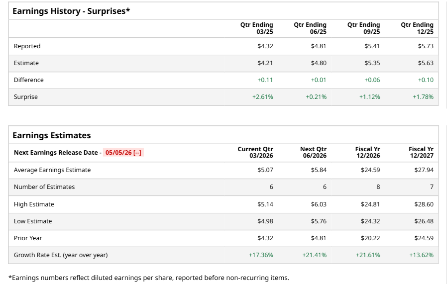 Corpay, Inc. (CPAY), headquartered in Atlanta, Georgia, operates as a payments company that helps businesses and consumers manage vehicle-related expenses, lodging expenses, and corporate payments. Valued at $21.8 billion by market cap, the company offers global payment, currency risk management, and invoice automation solutions which help businesses to control, simplify, and secure payment for vehicle related expenses, general payables, tolls, insurance, and lodging expenses. The tech giant is expected to announce its fiscal first-quarter earnings for 2026 in the near term.
