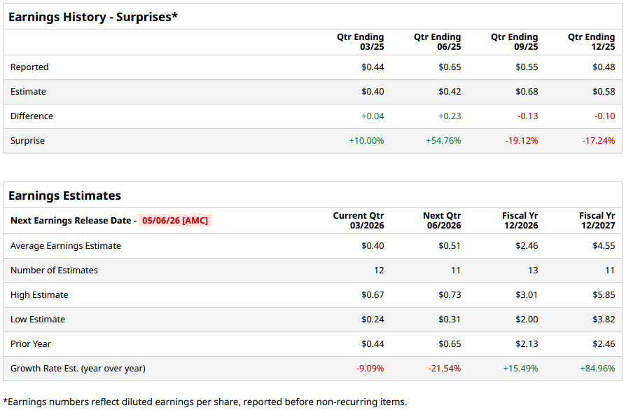 DASH is expected to release its Q1 2026 earnings on Wednesday, May 6, after the market closes. Ahead of the event, analysts expect the company’s EPS to be $0.40 on a diluted basis, down 9.1% from its year-ago quarter. The company has exceeded Wall Street’s EPS estimates in two of its last four quarters, while missing on two occasions.