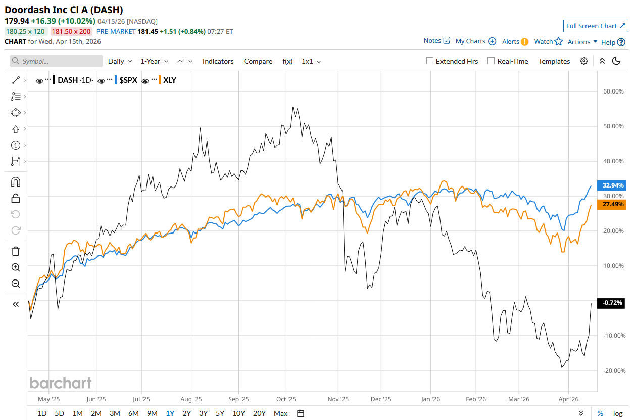 DASH stock has declined marginally over the past 52 weeks, underperforming the S&P 500 Index’s ($SPX) 30.1% rise and the State Street Consumer Discretionary Select Sector SPDR ETF’s (XLY) 25.1% return during the same time frame.