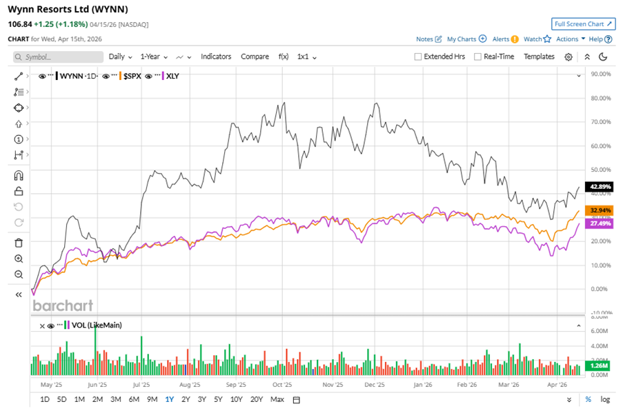 WYNN stock has outperformed the S&P 500 Index’s ($SPX) 30.1% gains over the past 52 weeks, with shares up 42.6% during this period. Similarly, it outperformed the State Street Consumer Discretionary Select Sector SPDR ETF’s (XLY) 25.1% gains over the same time frame.