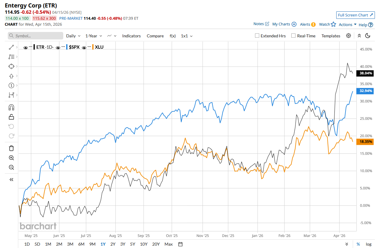 ETR stock has surged 37.7% over the past 52 weeks, outperforming the S&P 500 Index’s ($SPX) 30.1% rise and the State Street Utilities Select Sector SPDR ETF’s (XLU) 18.5% return during the same time frame.