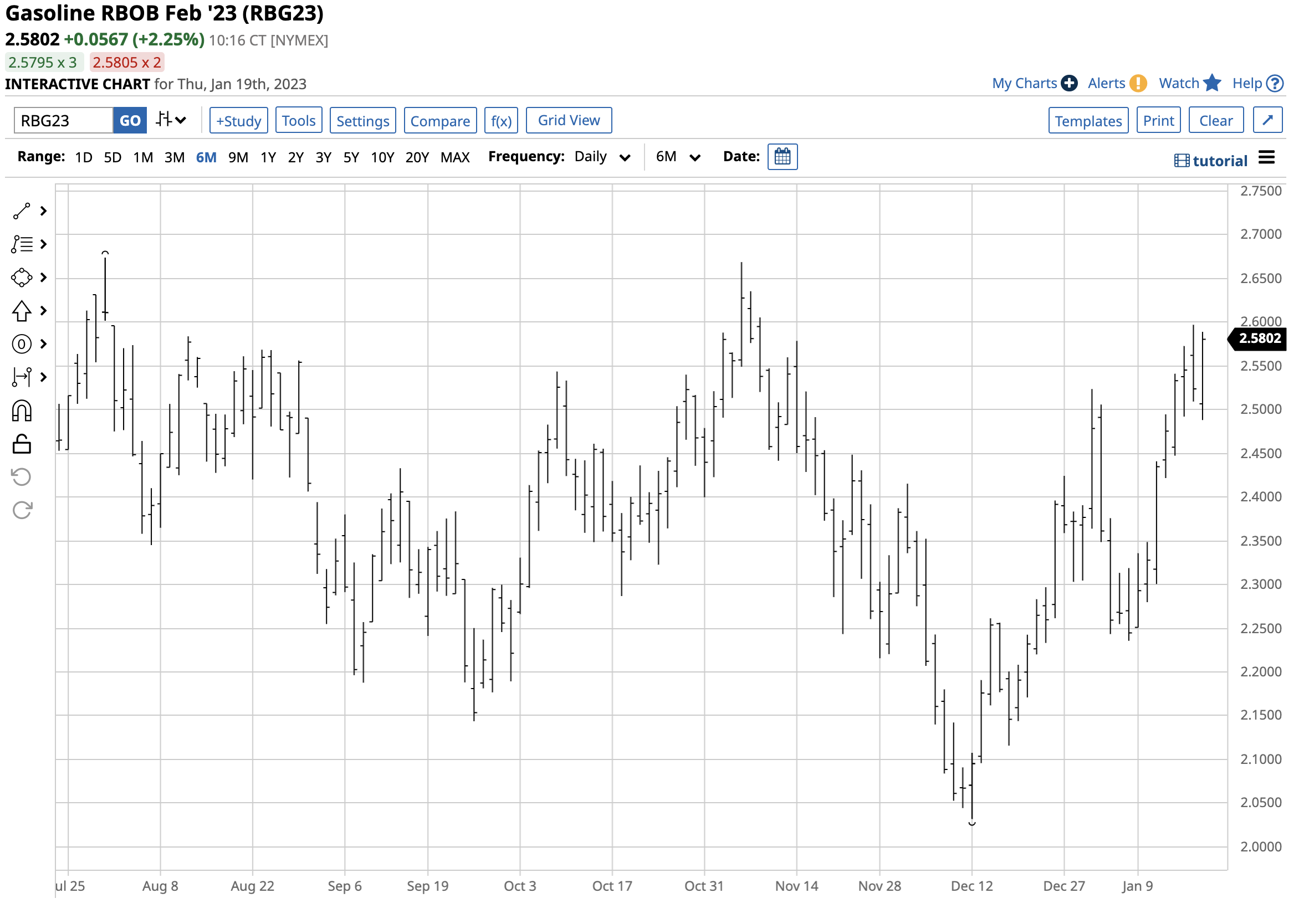 The chart shows the rise of gasoline for February delivery from $2.0321 on December 12, 2022, to over the $2.58 per gallon wholesale level on January 19, more than a 26% increase.