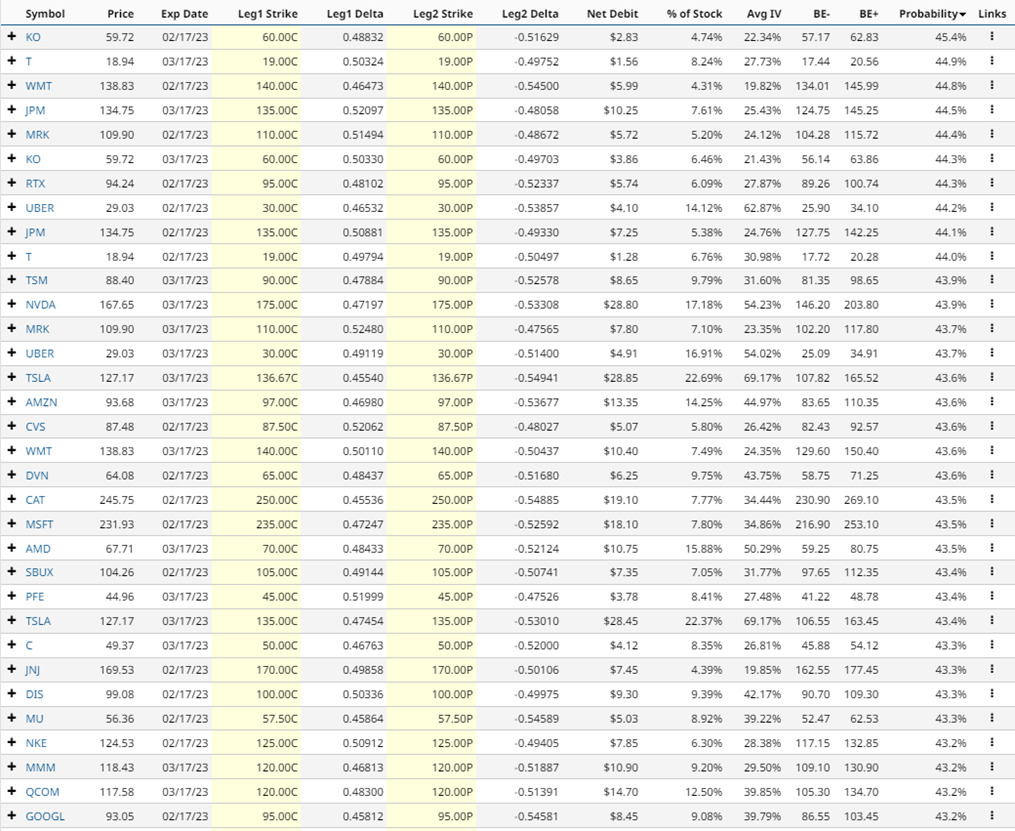 The screener shows some interesting long straddle trades on popular stocks such as KO, T, WMT, JPM, MRK, RTX, UBER, NVDA, TSLA and AMZN. Let’s walk through a couple of examples.