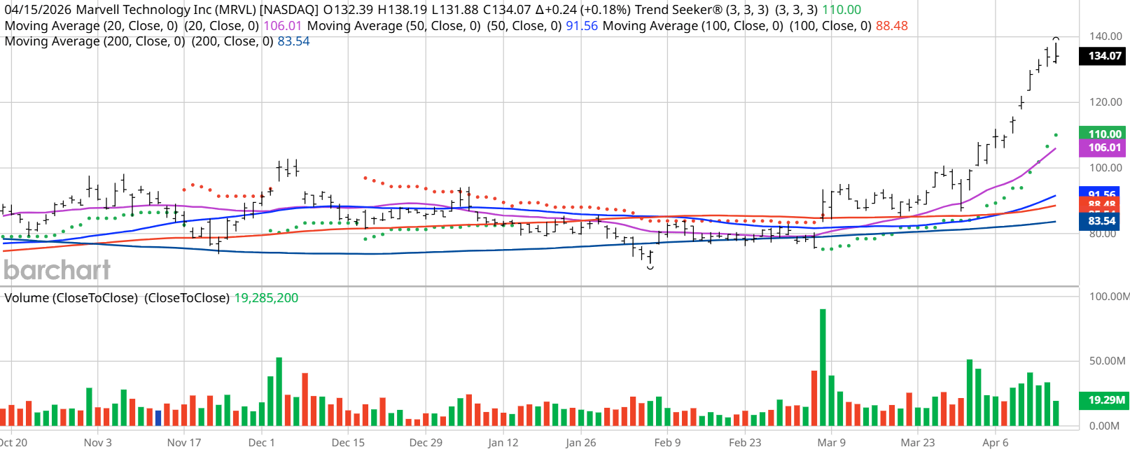 - Marvell Technology (MRVL) demonstrates strong technical momentum and is trading at new all-time highs.