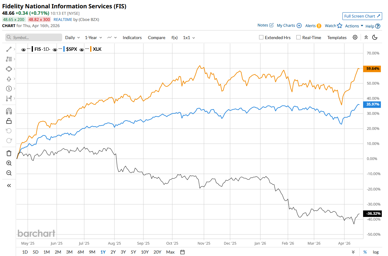 FIS stock has declined 28.9% over the past 52 weeks, underperforming the S&P 500 Index’s ($SPX) 33.2% rise and the State Street Technology Select Sector SPDR ETF’s (XLK) 55.5% rise during the same time frame.