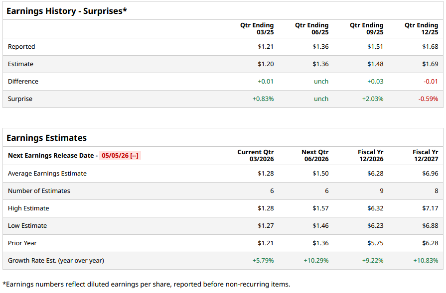 For fiscal 2026, analysts project the company’s EPS to be $6.28, up 9.2% from $5.75 in fiscal 2025. Moreover, its EPS is expected to rise by roughly 10.8% year over year (YoY) to $6.96 in fiscal 2027.