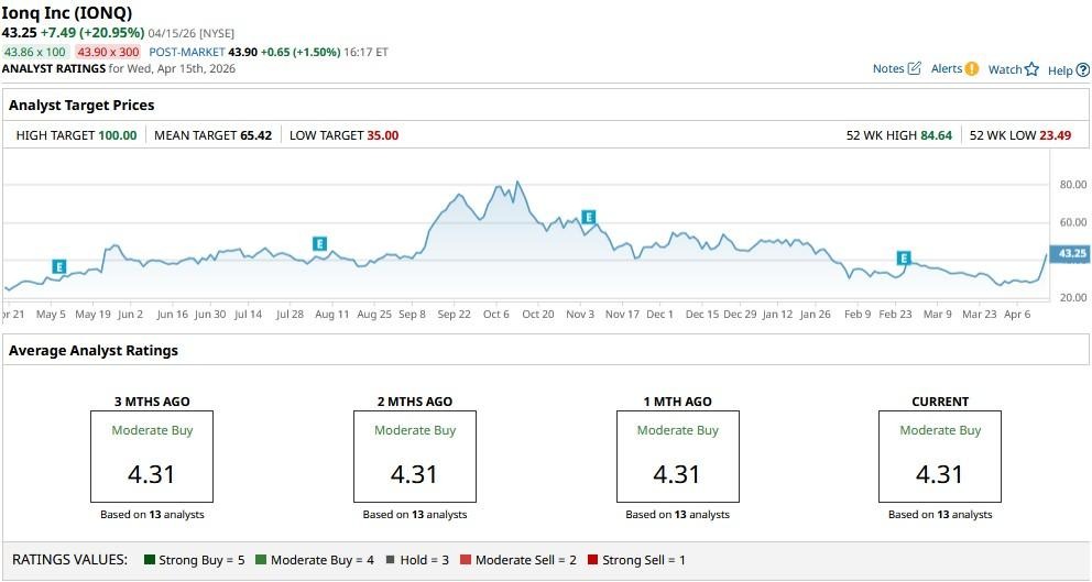 The consensus rating on IonQ shares is currently a “Moderate Buy,” with a mean price target of about $65, indicating potential upside of another 50% from here.