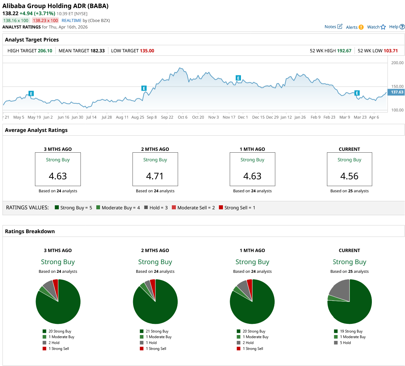 The unveiling of Amap’s quadruped and humanoid robots marks a pivotal moment for Alibaba, signaling its evolution into a leader of "Embodied AI." Currently, BABA stock carries a consensus "Strong Buy" rating backed by 25 analyst evaluations, including 19 “Strong Buy,” one "Moderate Buy," and five “Hold” designations. With a mean price target of $182.33, Alibaba offers a compelling 32% potential upside from its current market price.