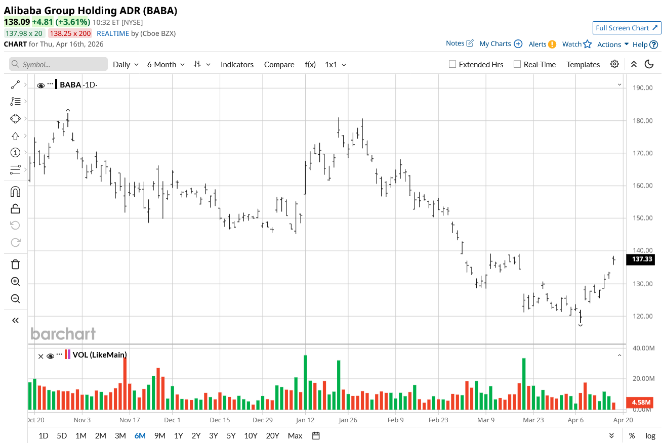 BABA stock has shown signs of a robust recovery, gaining roughly 30% over the past year as investor sentiment warms toward its cloud acceleration and aggressive AI roadmap. While it has faced a year-to-date (YTD) decline so far this year, recent momentum, including a 6.3% jump in the last week, has pushed shares toward the upper end of its 52-week range of $103.71-$192.67.