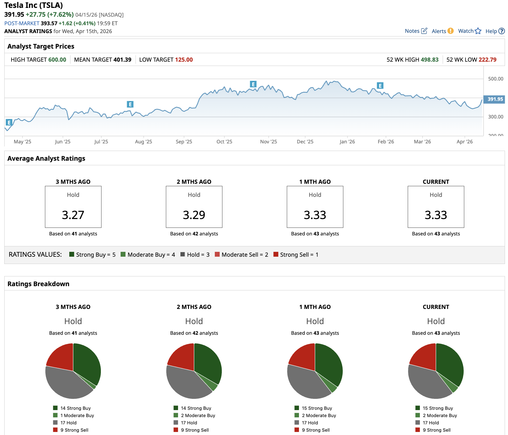 Out of the 43 analysts covering TSLA stock, 15 recommend “Strong Buy,” two recommend “Moderate Buy,” 17 recommend “Hold,” and nine recommend “Strong Sell.” The average TSLA stock price target is $401.39, above the current price of about $392.