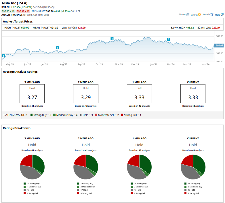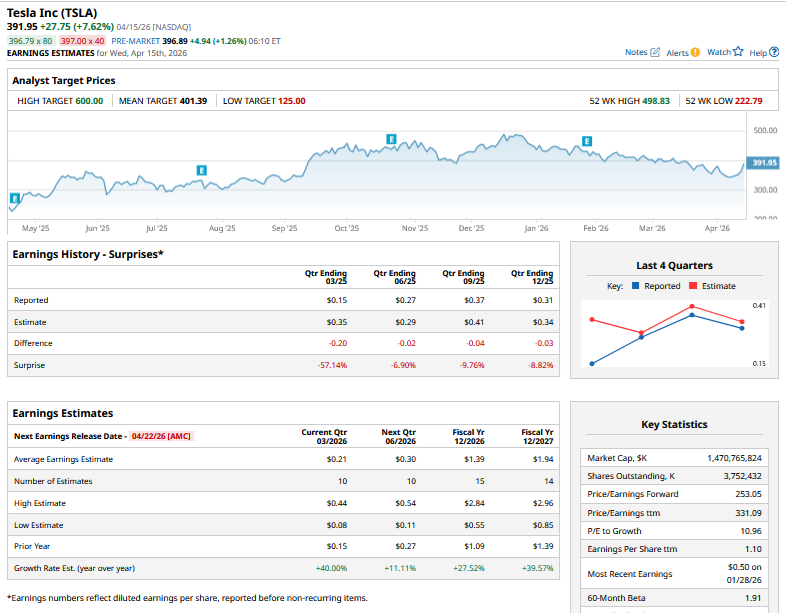 Tesla (TSLA) will release its Q1 2026 earnings on April 22 after the close of markets. The stock has gained traction over the last couple of days and is approaching the $400 price level. Analysts are divided on TSLA stock heading into the Q1 confessional, given the divergent fortunes of the automotive and artificial intelligence (AI) businesses. Let's explore whether TSLA stock is a buy ahead of the report.