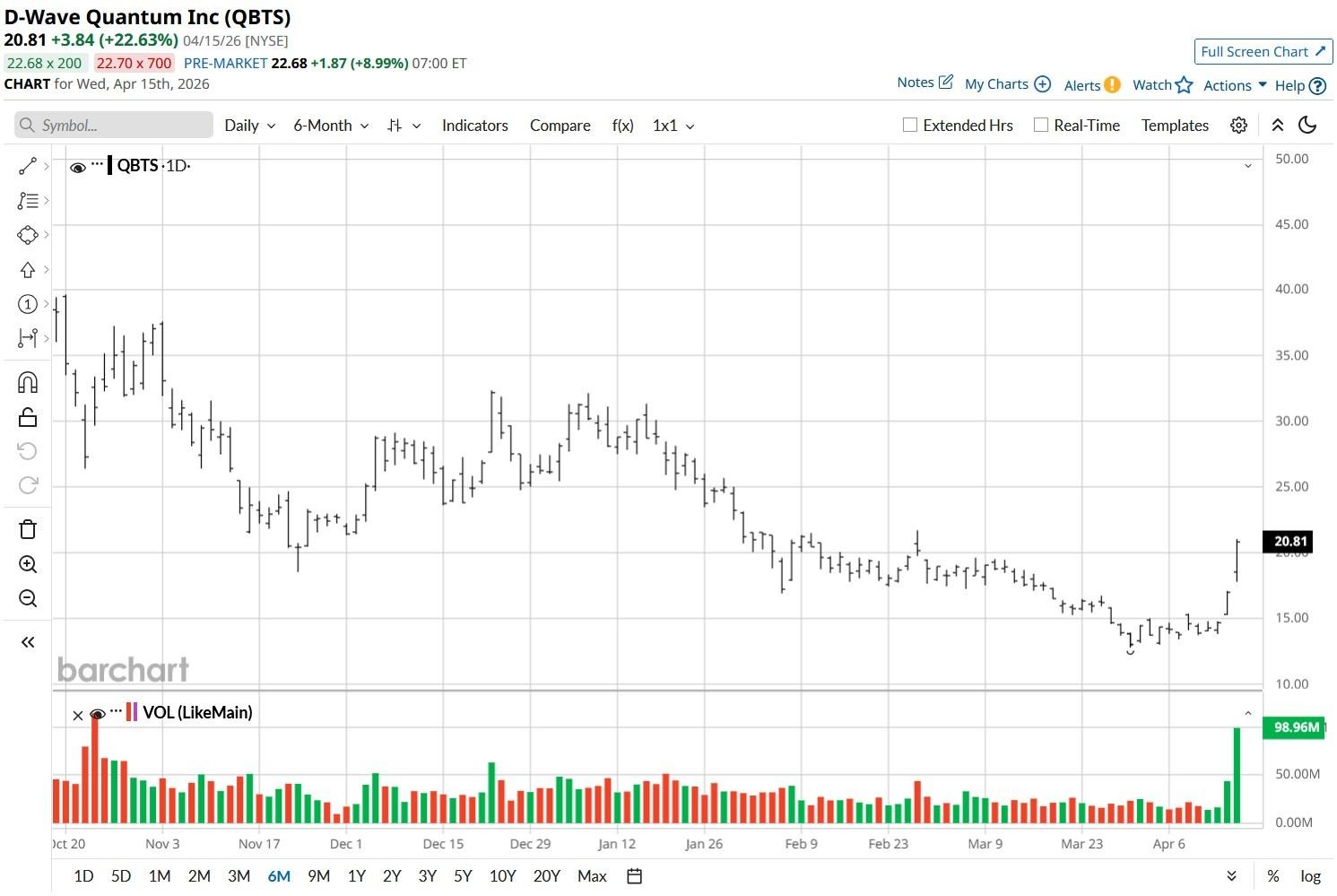 D-Wave Quantum (QBTS) stock soared on April 15 after Nvidia’s (NVDA) announcement of its open-source Ising artificial intelligence models built specifically for quantum computing.