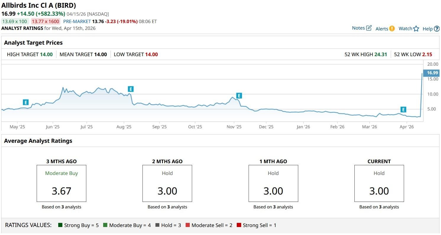 According to Barchart, the consensus rating on Allbirds sits at a “Hold” currently, with the mean price target of $14 indicating potential downside of more than 17% from here.