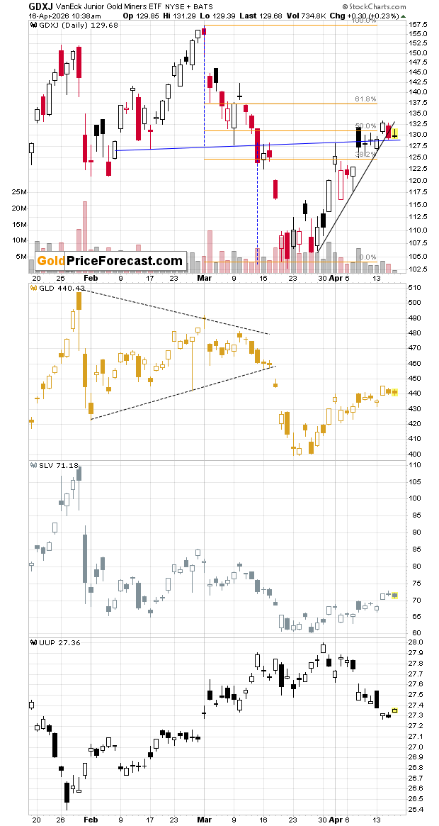 Earlier today, the GDXJ moved back to the previously broken support line and then declined after verifying it as resistance. It looks like miners are preparing for a move lower and that we won’t have to wait for that for much longer.